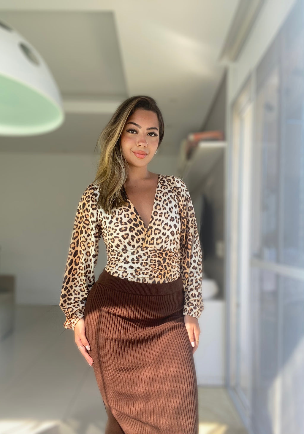 Este Body de Onça em tecido fluity é perfeito para quem procura conforto e estilo. Feito com um tecido fluity macio e leve, este body irá te manter elegante e confortável ao mesmo tempo. Seu design em estampa de onça é moderno e sofisticado, tornando-se uma peça versátil para qualquer ocasião.