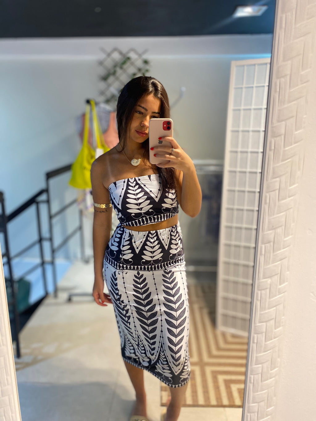 Um conjunto leve e estiloso, da blusa tomara que caia até a saia, que valoriza a silhueta com conforto e frescor. A blusa traz modelagem justa com elástico atrás, sem alças visíveis, realçando o colo com elegância. A estampa vibrante, aliada ao lycra, garante conforto e personalidade ao look. Por se tratar de conjunto, as peças proporcionam uma série de composições de looks. Ideal para usar em dias quentes, eventos ao ar livre ou passeios descontraídos com estilo contemporâneo e leveza.
